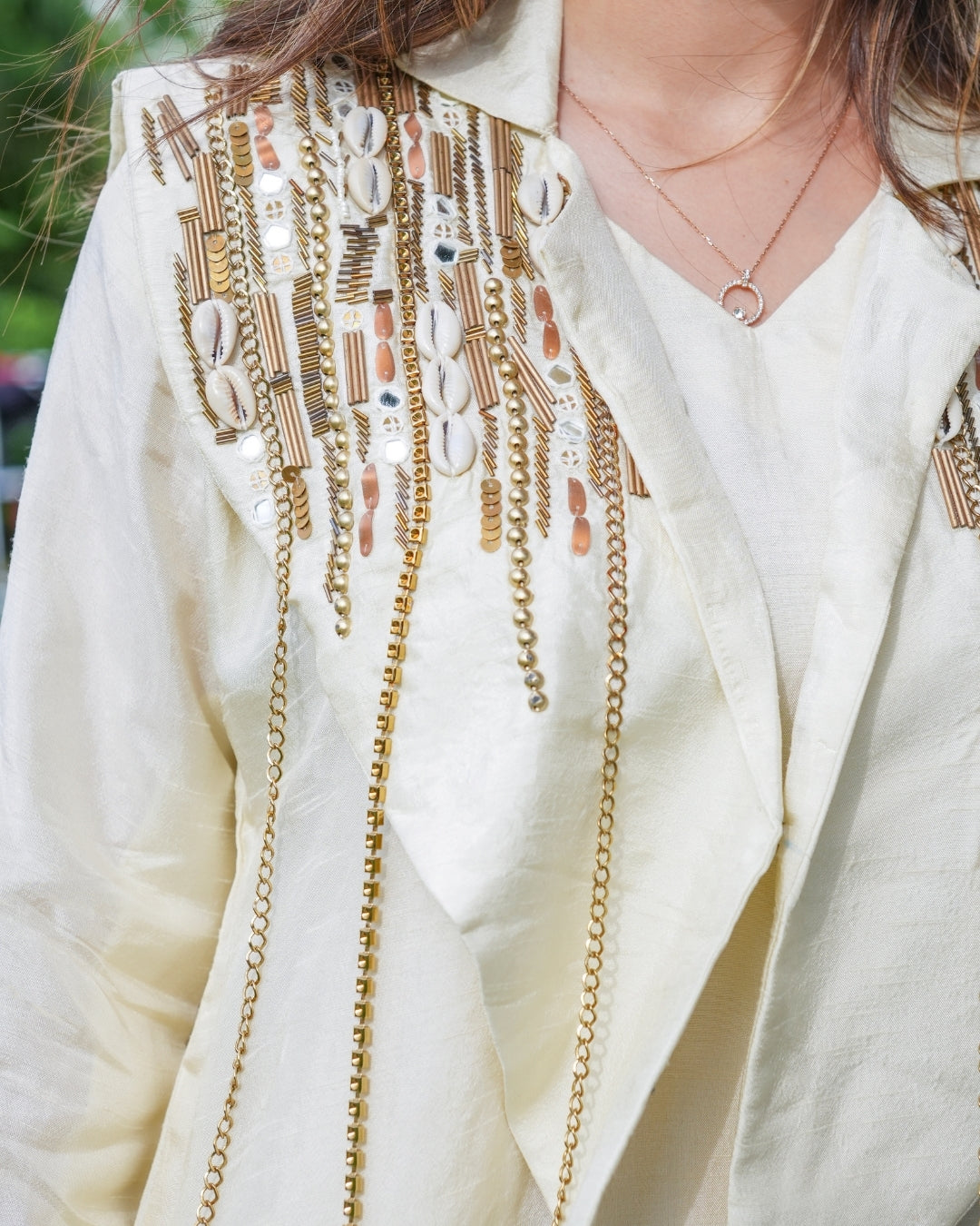 The set features a minimalist ivory kurta and flared palazzo pants, offering a clean and elegant silhouette. What truly sets this outfit apart is the short indo-western shrug, adorned with intricate handwork detailing in metallic tones — an artistic blend of embroidery and embellishment that mimics cascading chains and mirror accents.
