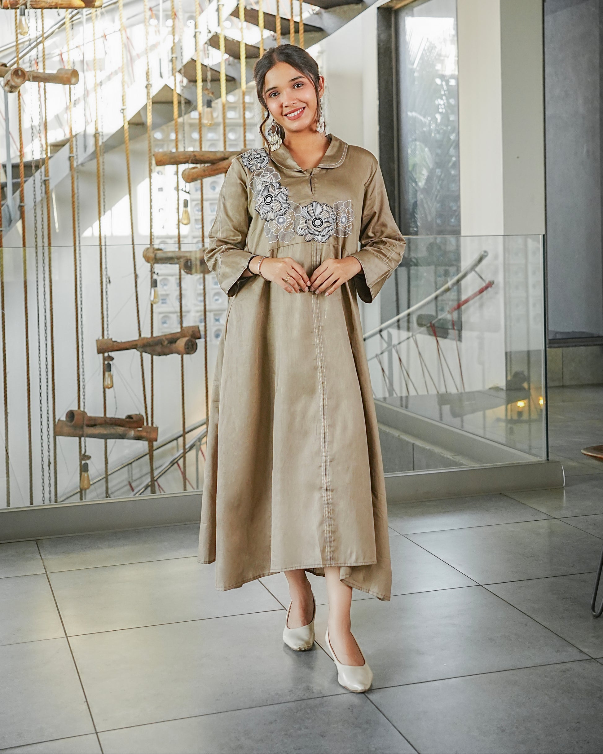 Understated elegance meets timeless charm in our Sandstone Grace Tunic. Crafted in a soft taupe-hued linen blend, this flared silhouette features intricate floral embroidery in delicate silver thread across the yoke and shoulders. The subtle collar and relaxed fit enhance its wearability, while the full sleeves with a hint of detailing add a refined edge.