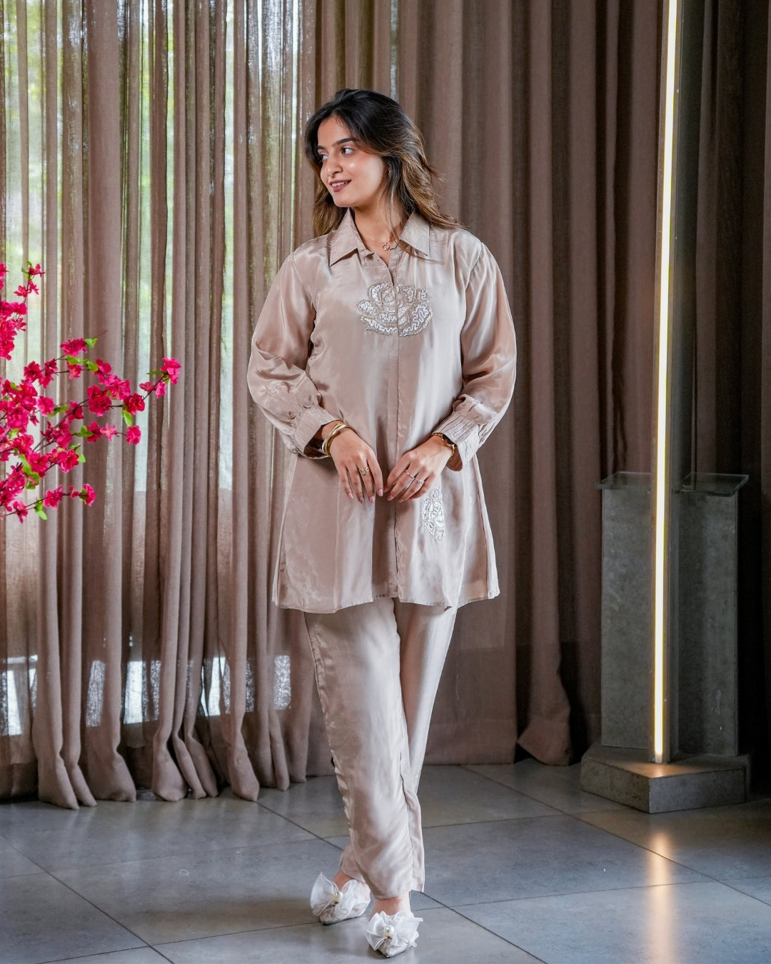 The soft mocha tone enhances the richness of the fabric, while delicate silver embroidery adorns the front and sleeves, adding a hint of sparkle and refinement. The collared shirt-style kurta features a button-down front and full sleeves with light gathers for a subtly dramatic finish. Paired with straight-fit trousers in the same graceful grape fabric, this look balances structure with sophistication.