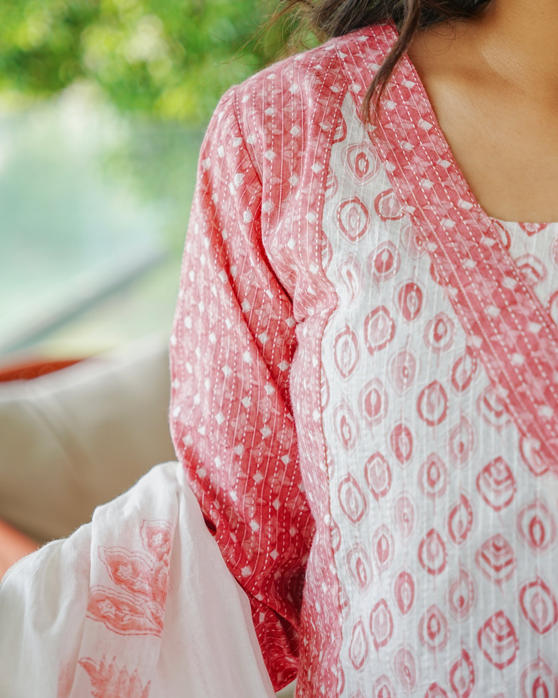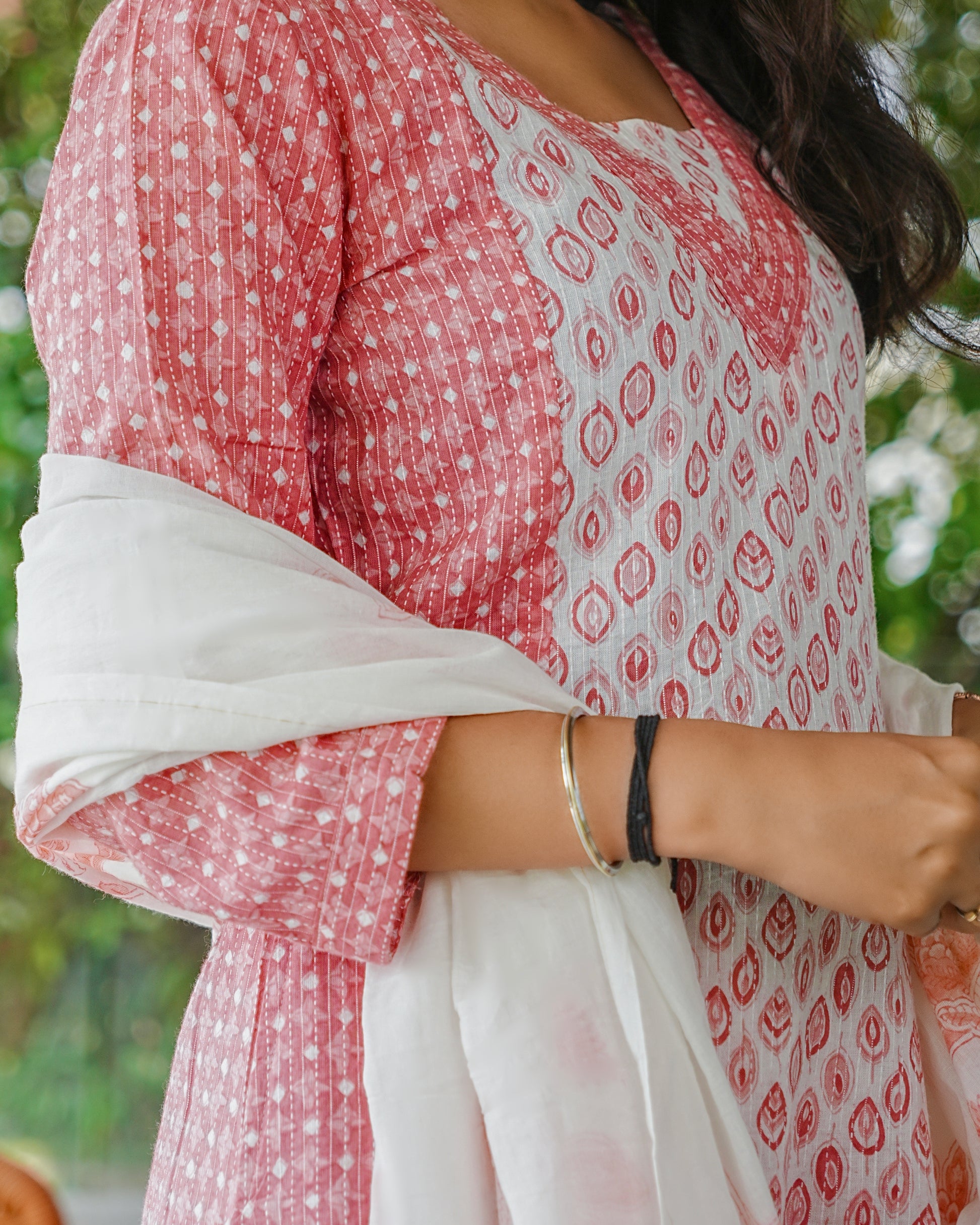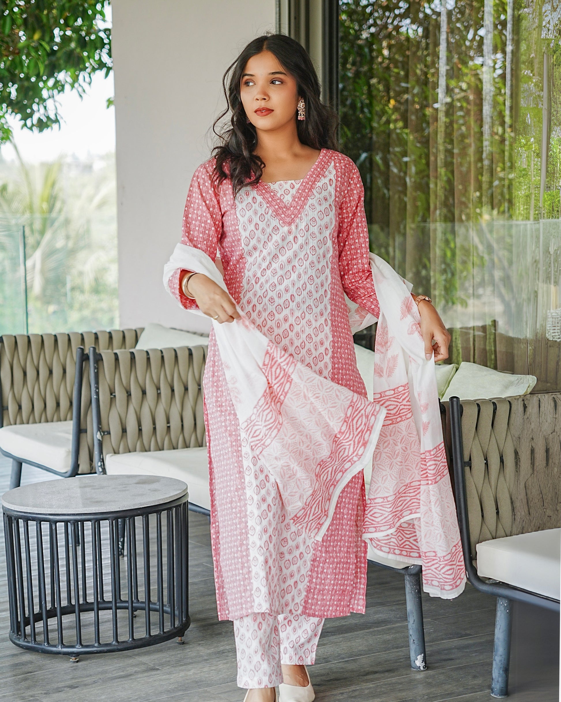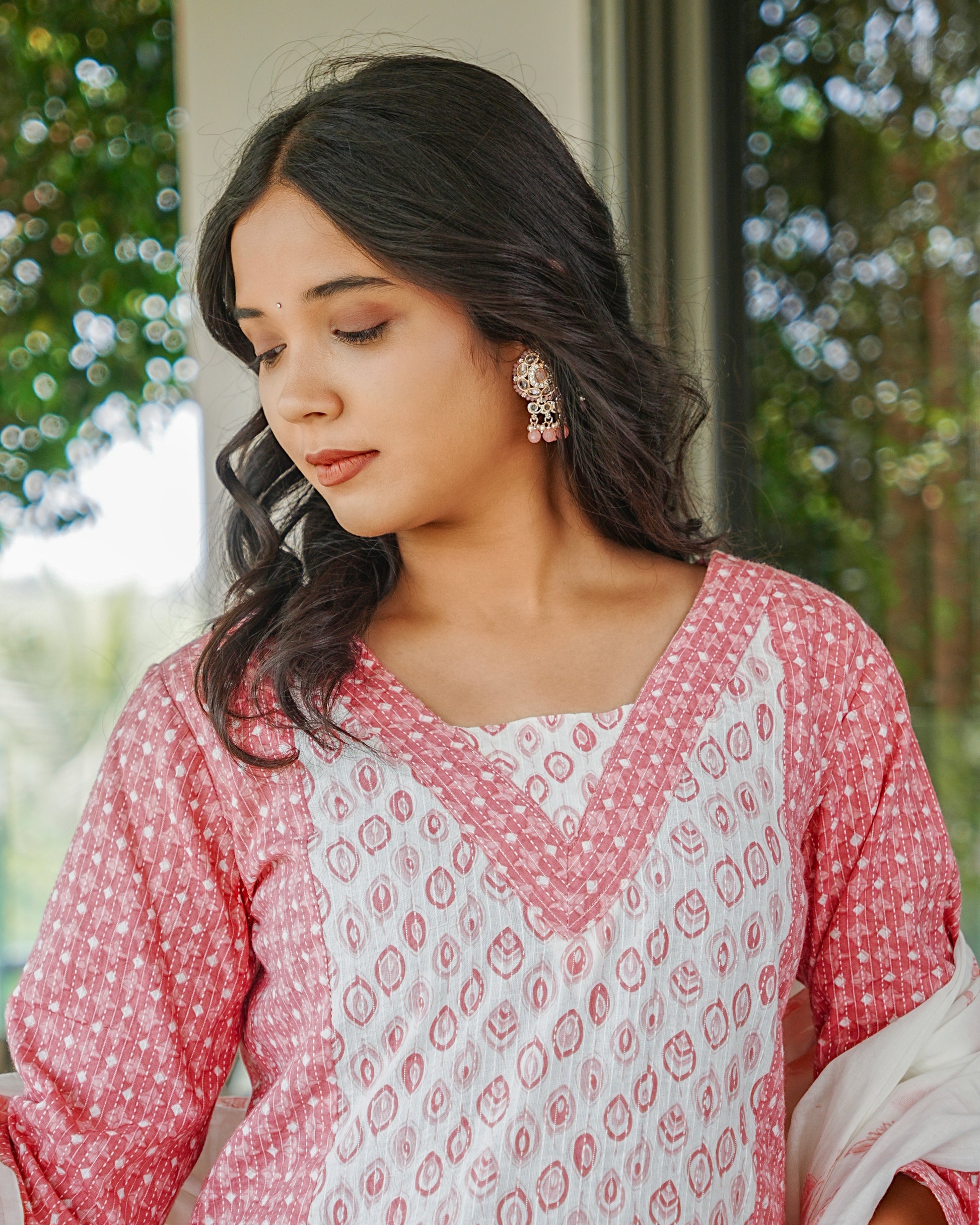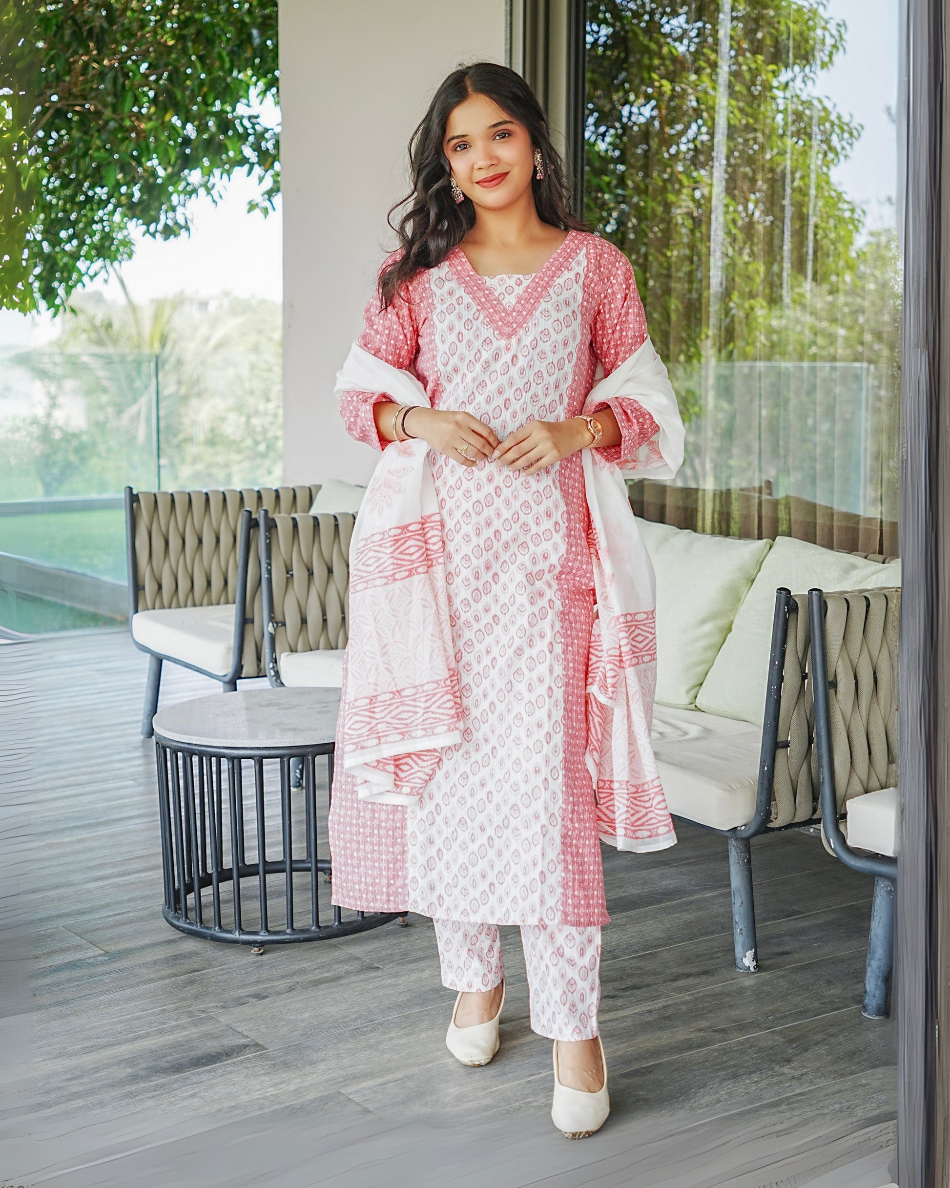 Step into comfort and elegance with our soft cotton ethnic set, designed for effortless style and everyday charm. This outfit features a graceful white base with delicate pink floral prints, complemented by a beautifully coordinated dupatta. Made from pure cotton, it's lightweight, breathable, and perfect for both casual outings and festive gatherings.