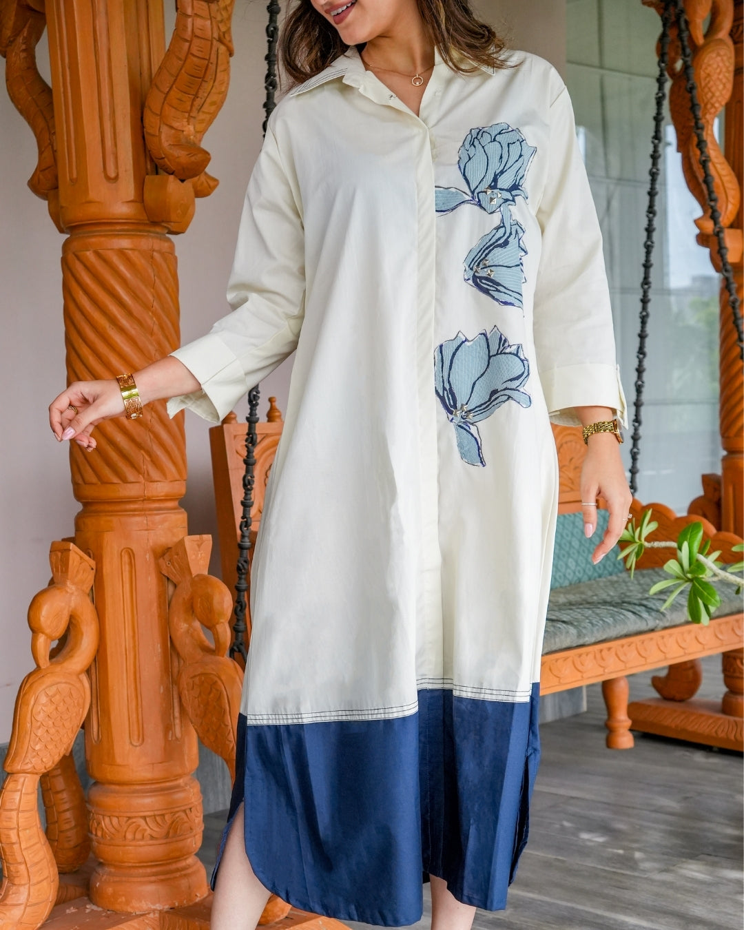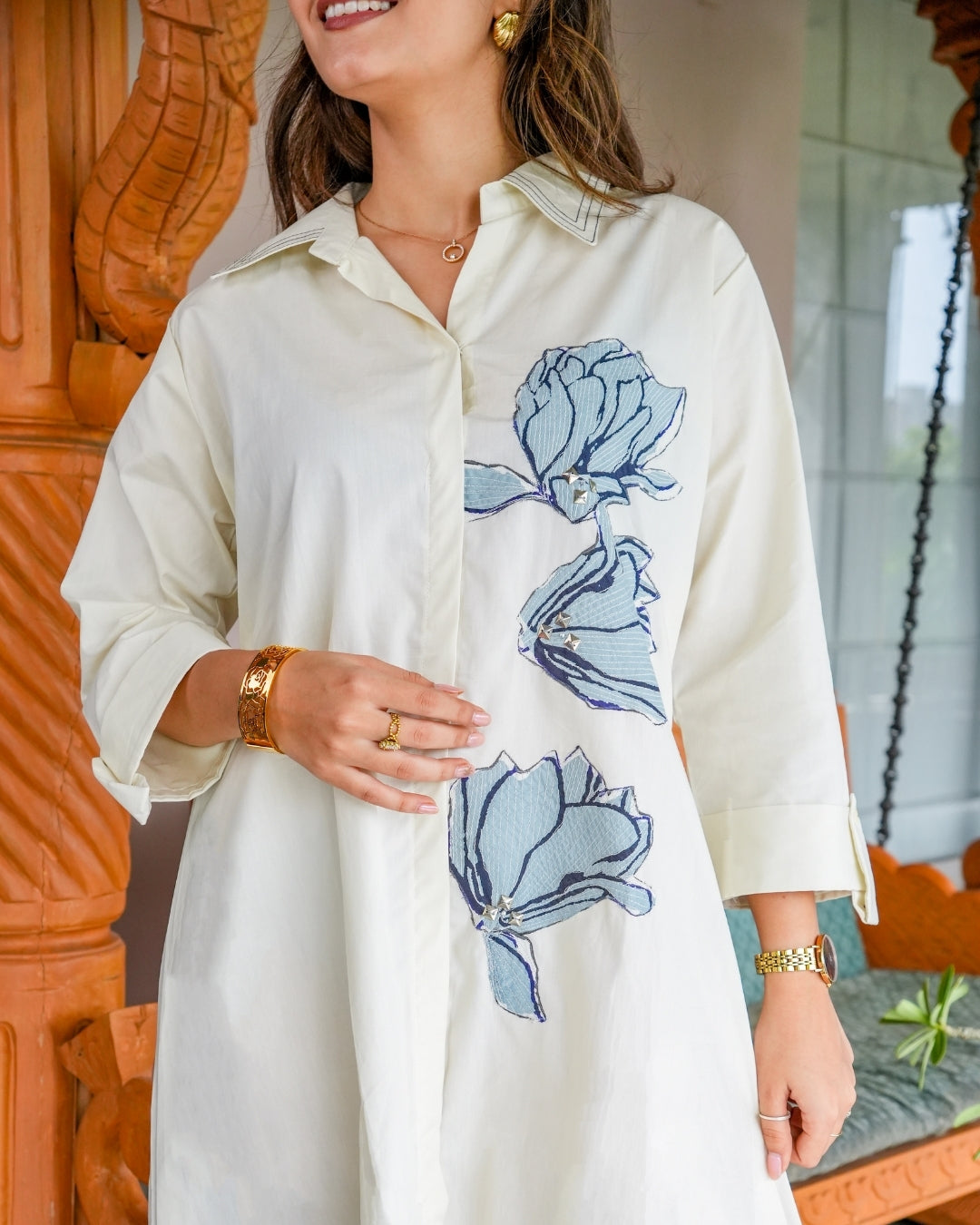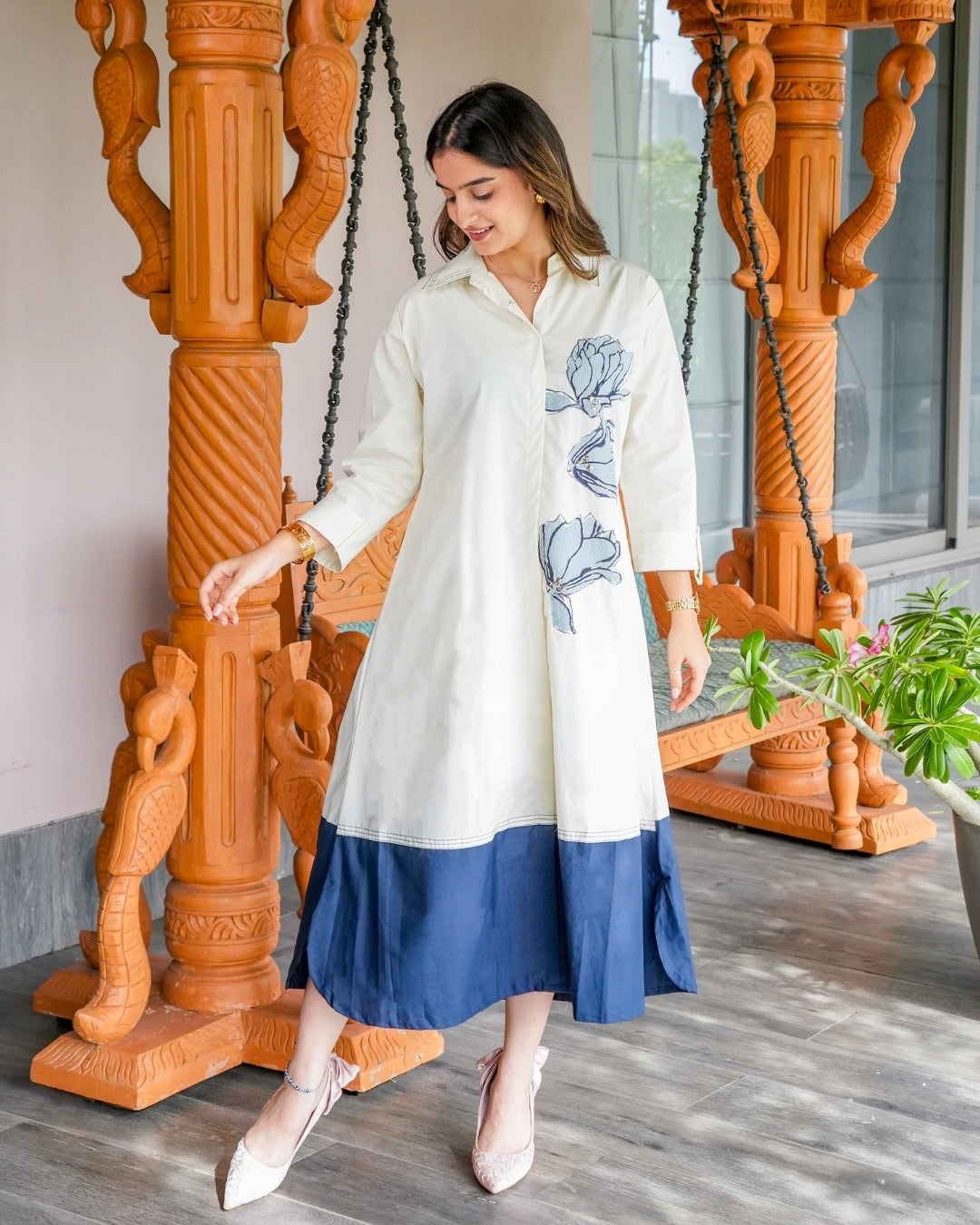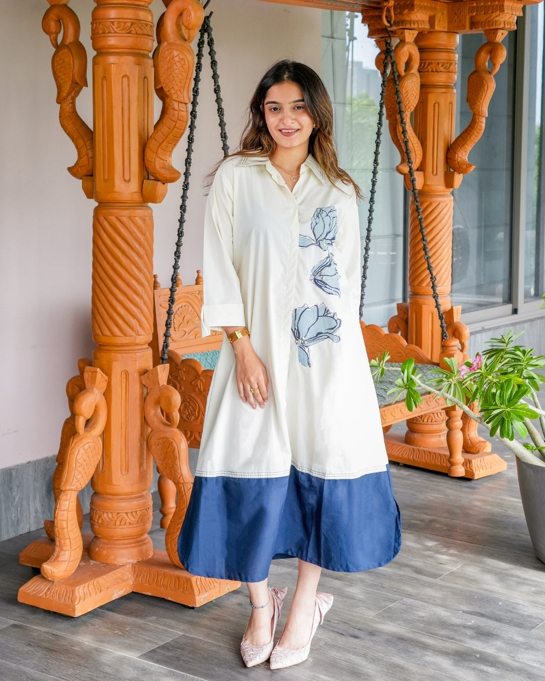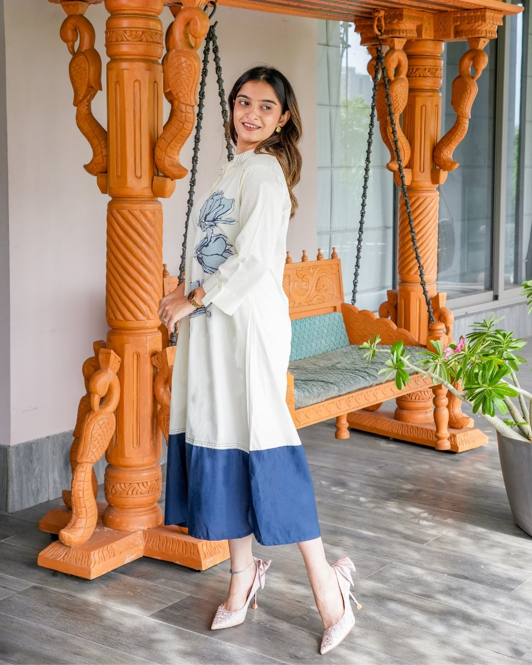 The clean ivory upper is beautifully contrasted by a deep navy hemline, giving it a modern edge. Delicate floral patchwork with subtle hand embroidery adds charm and uniqueness to this minimal yet striking design — perfect for casual brunches, relaxed office days, or intimate gatherings.