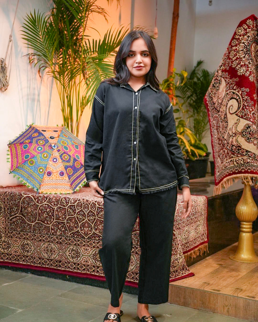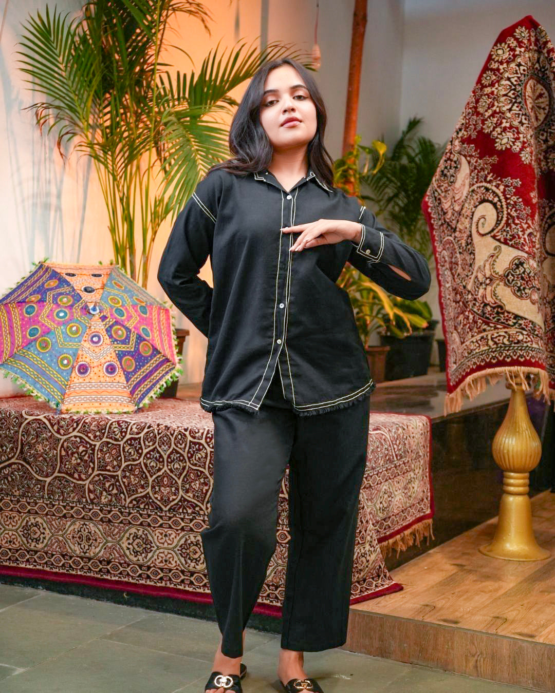 Make a powerful statement with our Abstract Faces Embroidered Black Co-Ord Set—a modern artistic ensemble that brings together bold minimalism and expressive design. Crafted from a soft, breathable fabric, this two-piece set includes a relaxed-fit button-down shirt and straight-cut trousers in classic black, elevated with unique detailing.