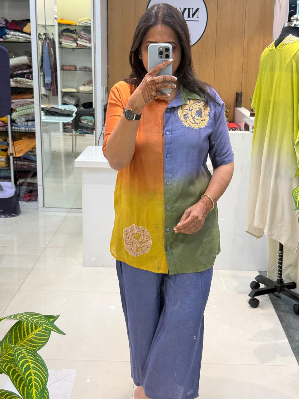 Stylish multicolour shirt set featuring a contemporary color-blocked design with hand-embroidered motif detailing. Paired with relaxed straight-fit pants, this chic ensemble blends comfort with modern elegance, perfect for casual outings and smart day wear.