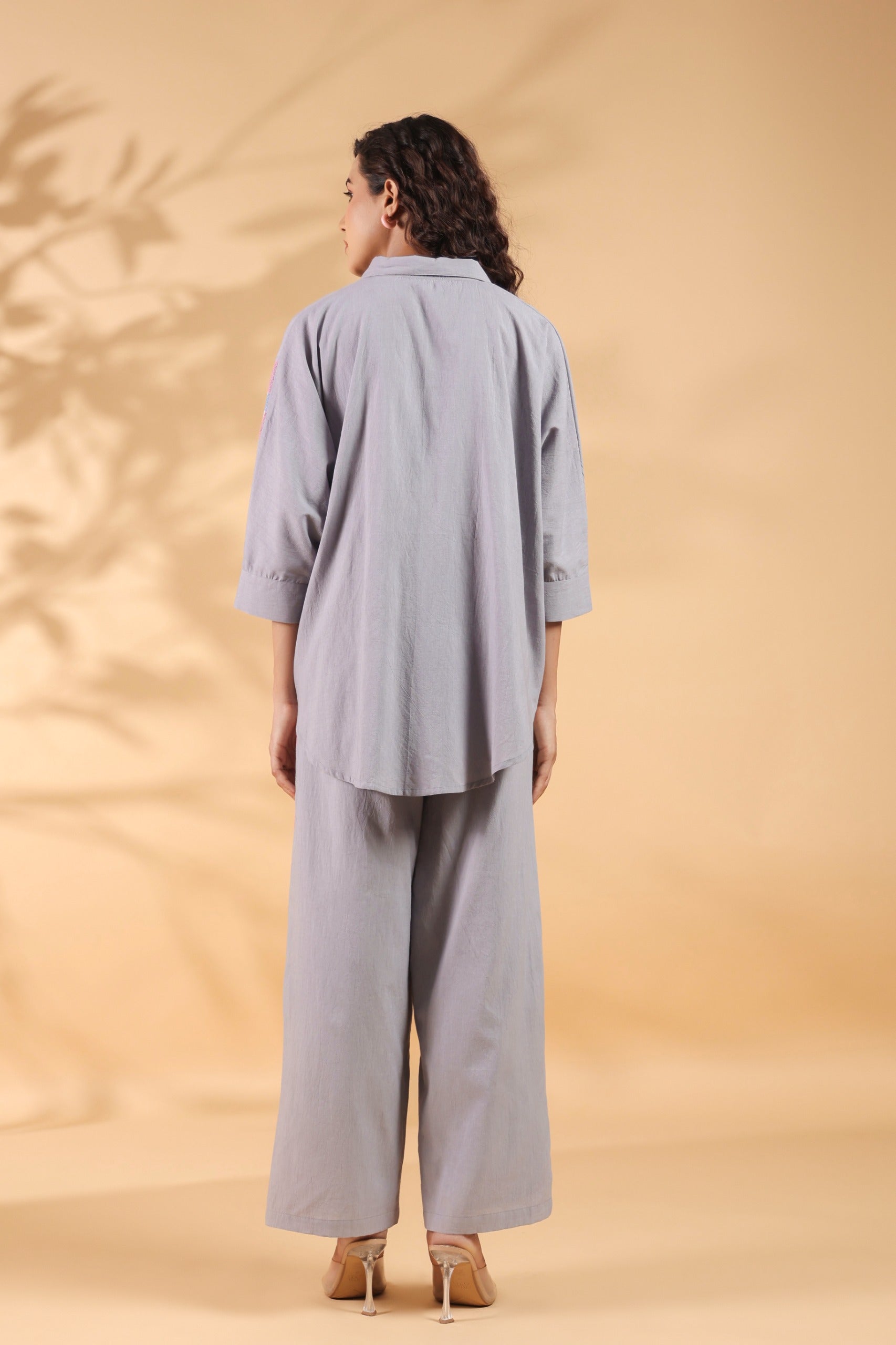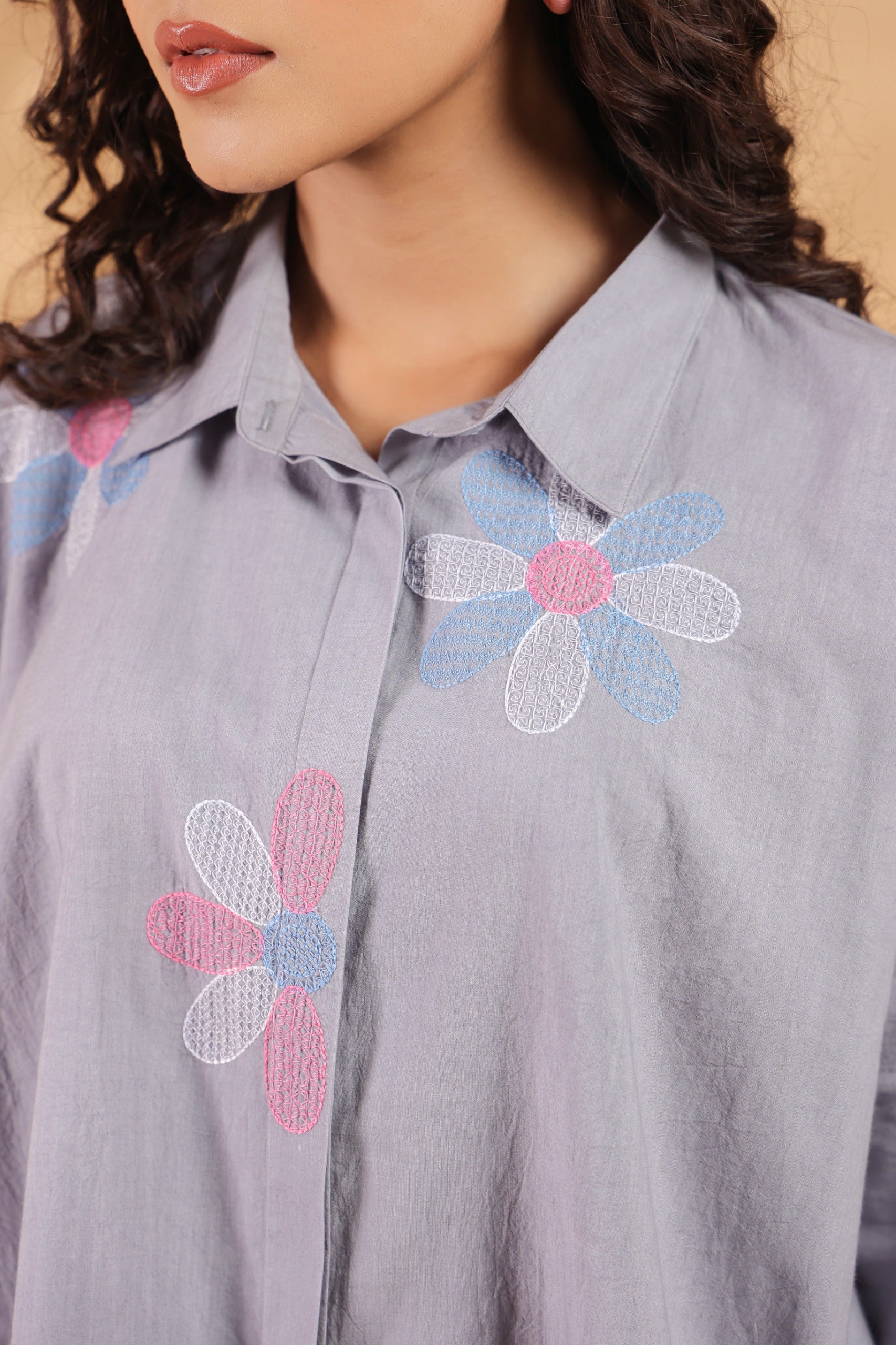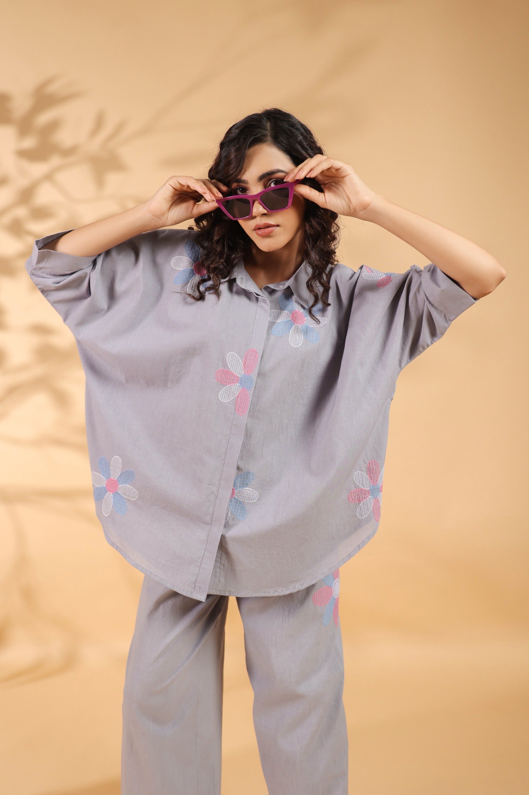 Fresh, fun, and unapologetically stylish – the Lilac Bloom Oversized Co-ord Set is your new wardrobe must-have. Crafted from soft, breathable cotton, this two-piece set brings together comfort and charm in perfect harmony. The oversized shirt features playful daisy-inspired hand embroidery in pastel hues of pink, blue, and white, adding a sweet pop of color to the muted lilac-grey base.