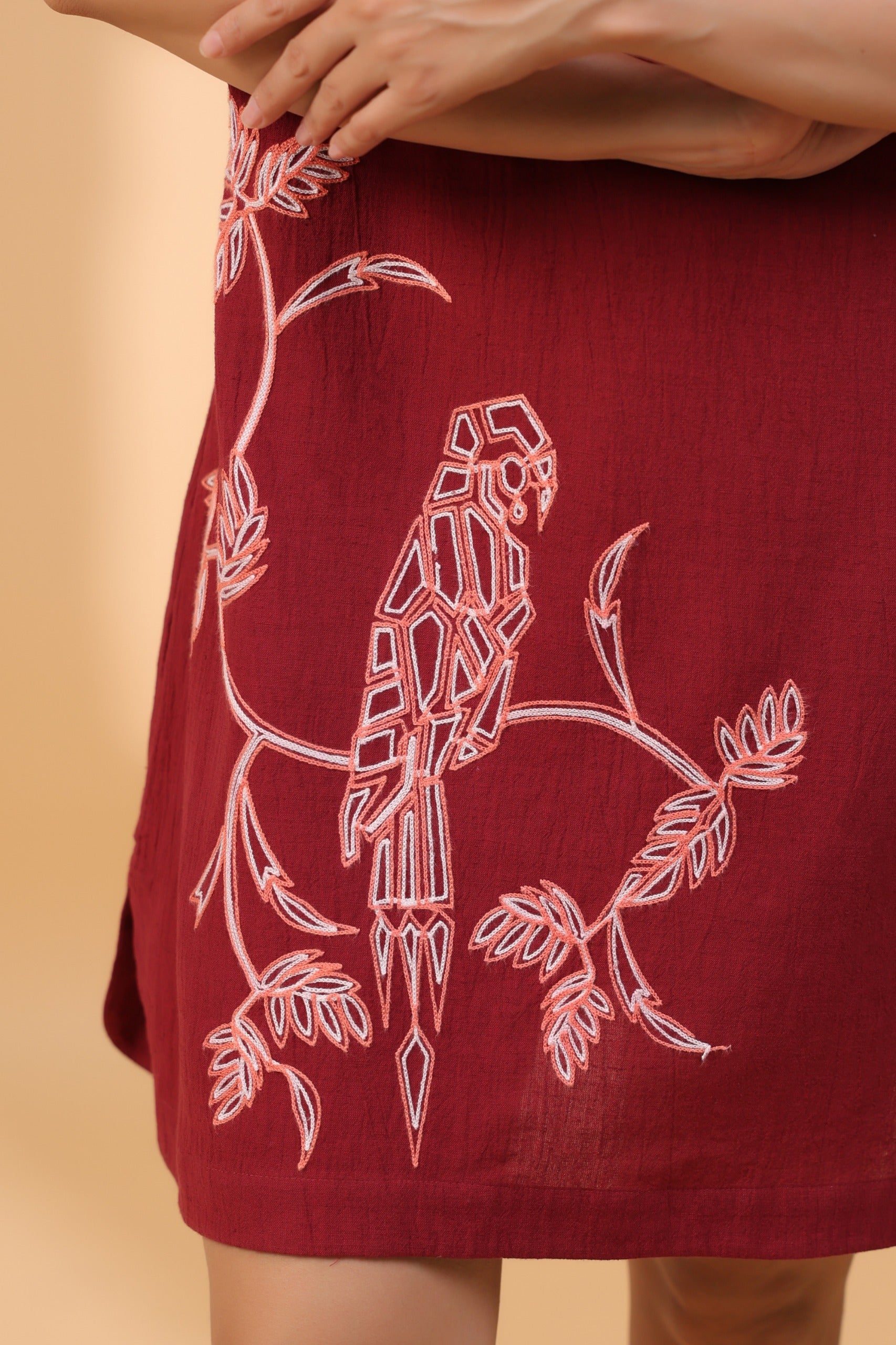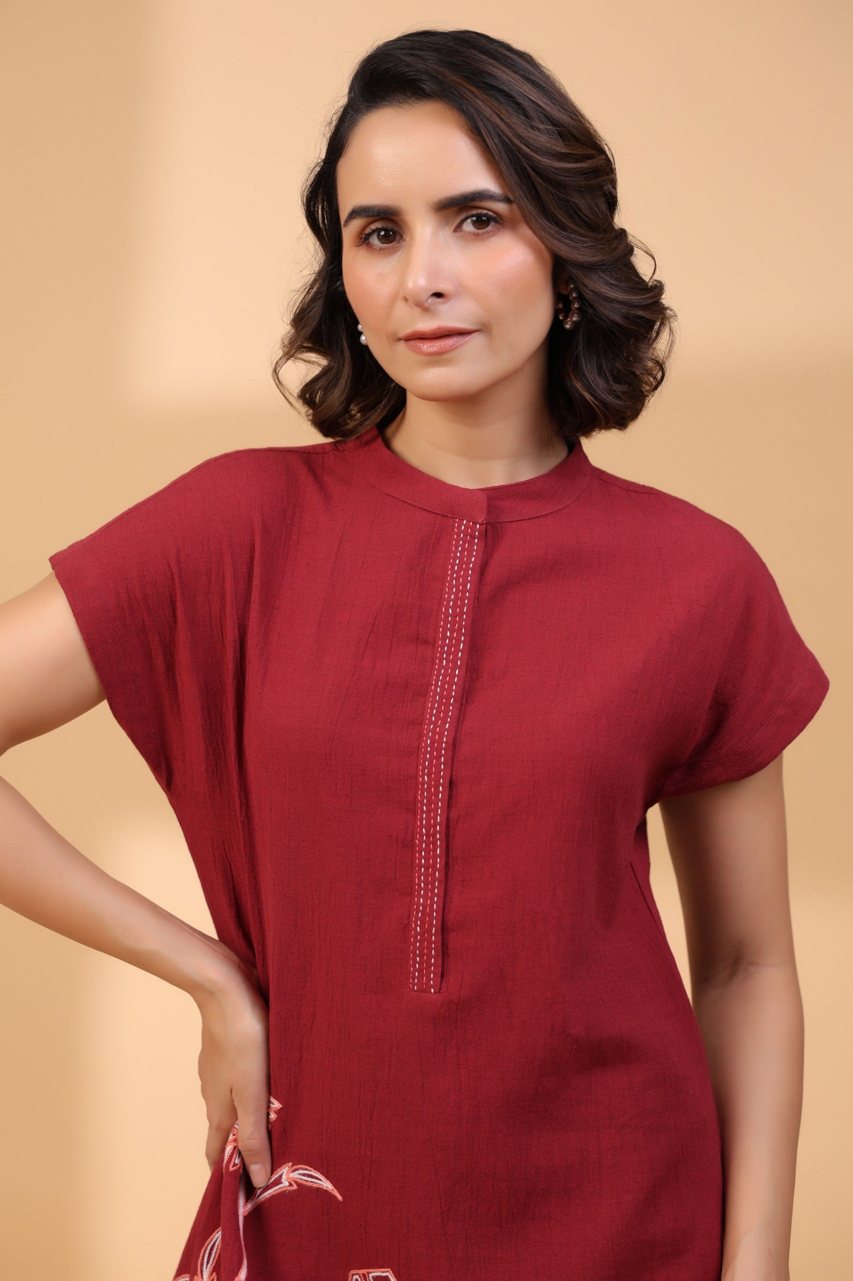 Make a bold yet graceful statement with the Maroon Parrot Embroidered Short Tunic Dress. This chic short tunic, crafted from breathable cotton slub fabric, combines effortless styling with detailed artistry. The rich maroon hue is elevated by the intricate thread embroidery of a stylized parrot perched amidst foliage — a design that symbolizes freedom, beauty, and individuality.