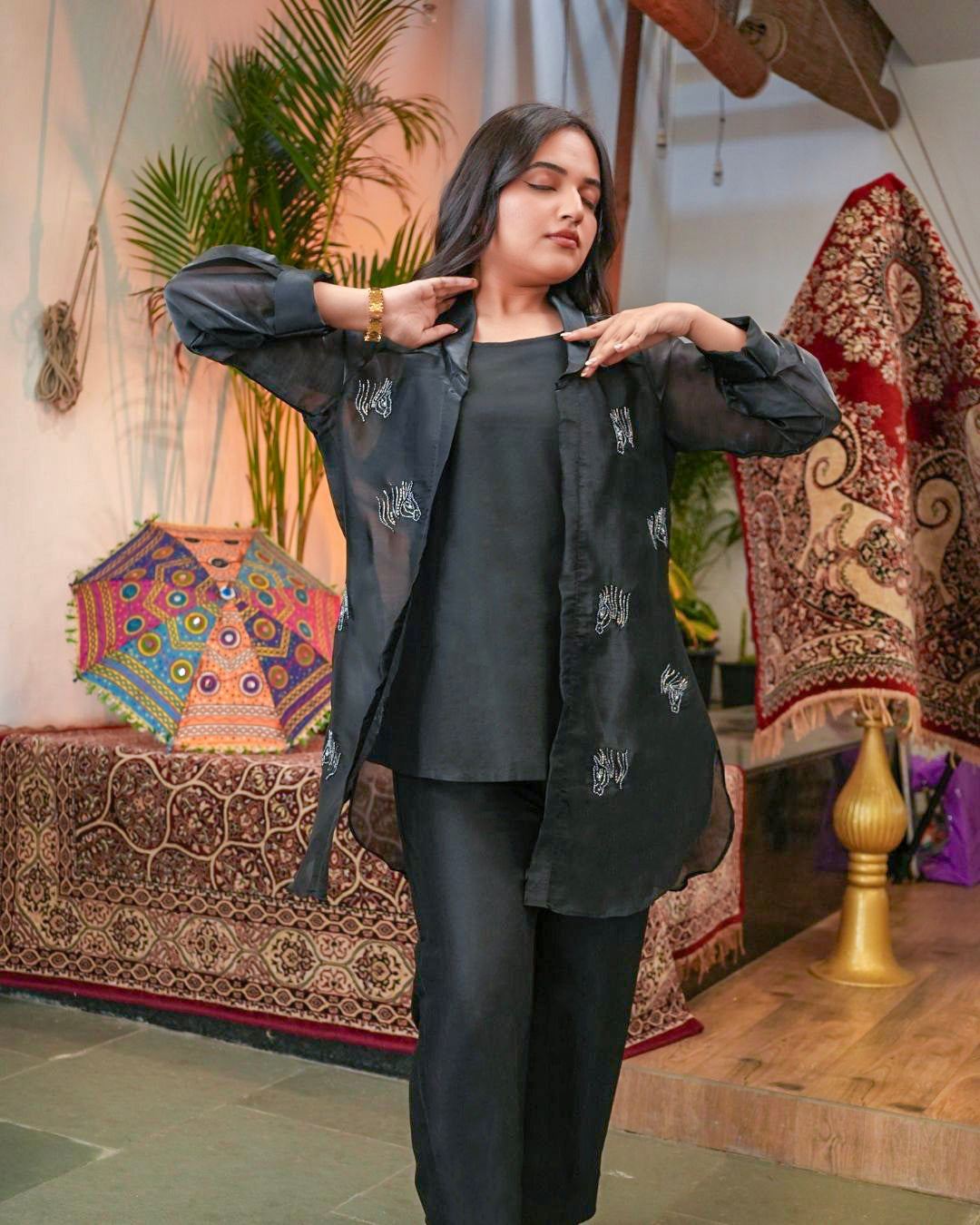 The organza overlay is designed with full-length sleeves and a relaxed silhouette that effortlessly drapes over the body, offering both comfort and grace. Underneath, a solid black inner top adds depth and layering, paired with matching black wide-legged trousers that complete the chic monochrome look.
