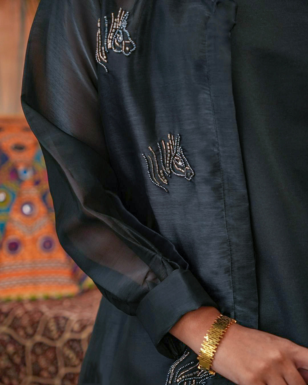 Step into sophistication with our Midnight Muse Organza Co-Ord Set, a stunning fusion of elegance and statement design. This three-piece ensemble features a sheer black organza overlay shirt adorned with intricate hand-embroidered horse motifs made from fine beads, lending a subtle yet striking artistic flair.