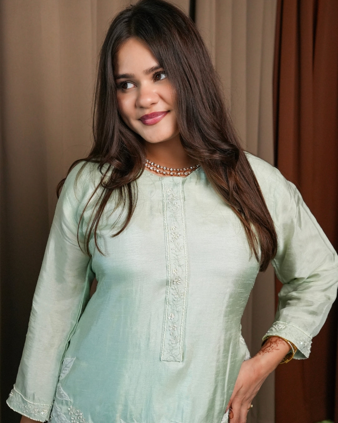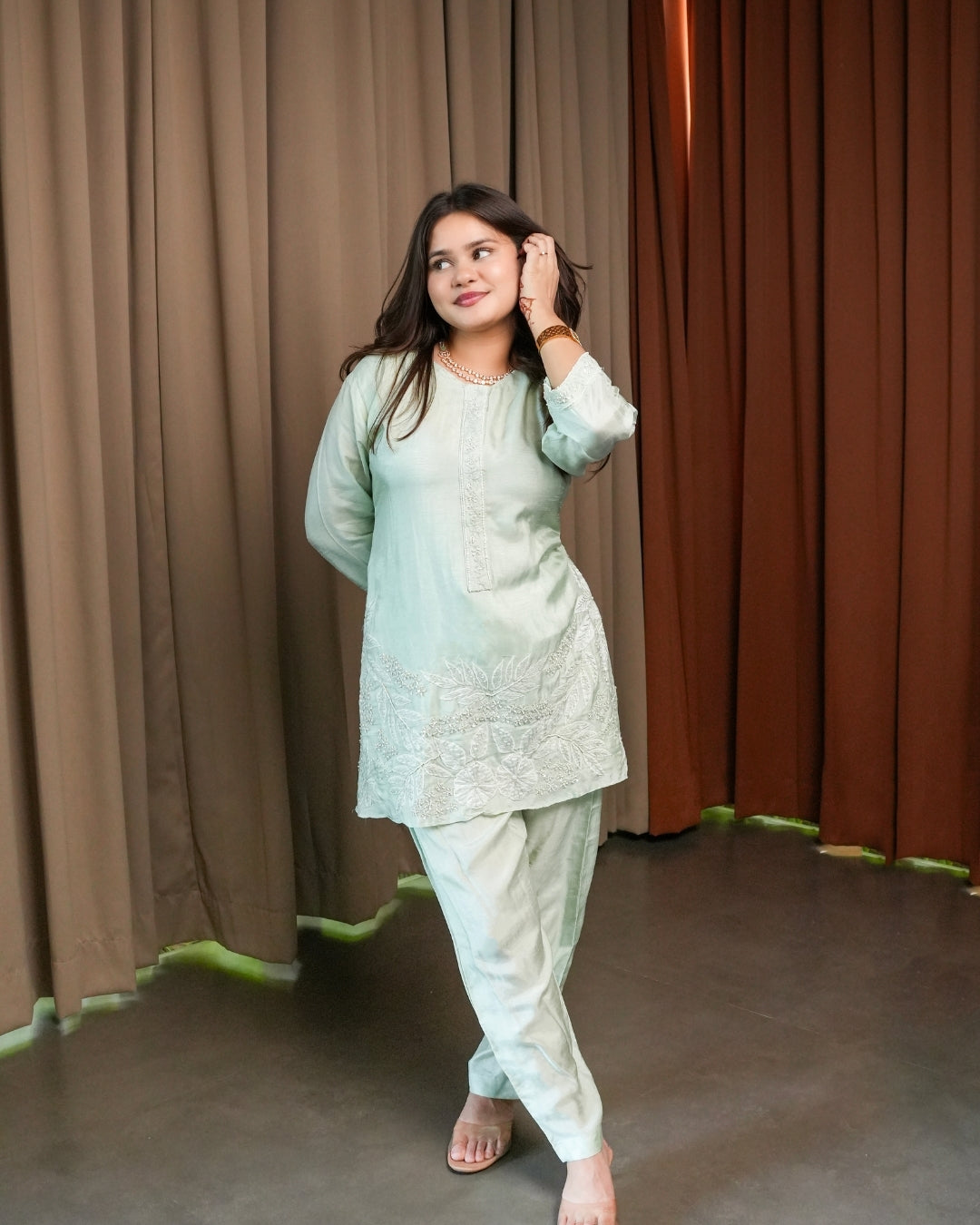 A graceful mint green coord set crafted from luxurious pure silk, designed for effortless elegance. The kurta features delicate embroidery along the hemline and subtle detailing on the neckline, lending a refined charm. Paired with straight-fit silk pants, this ensemble strikes the perfect balance of sophistication and comfort. Ideal for festive gatherings, intimate celebrations, or elevated everyday wear.