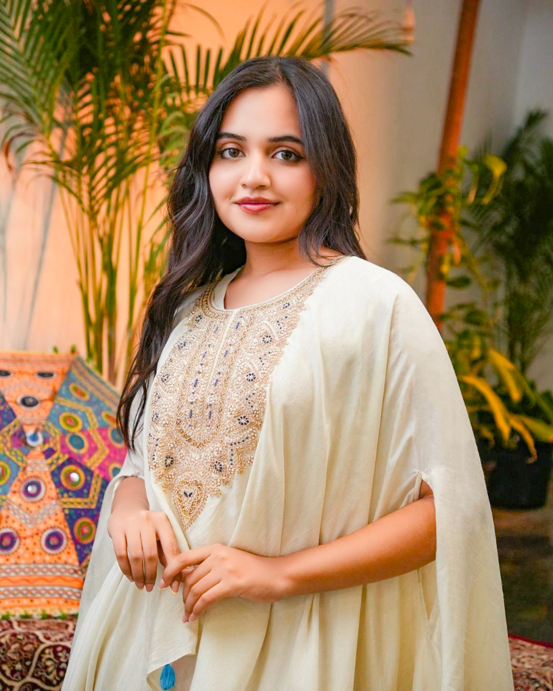 The centerpiece of this ensemble is the intricately hand-embellished yoke, adorned with delicate zari embroidery, sequins, and stonework that adds a regal charm. Tassel accents at the hemline bring playful movement to the outfit, while subtle sleeve slits add a touch of drama and ease of movement.
