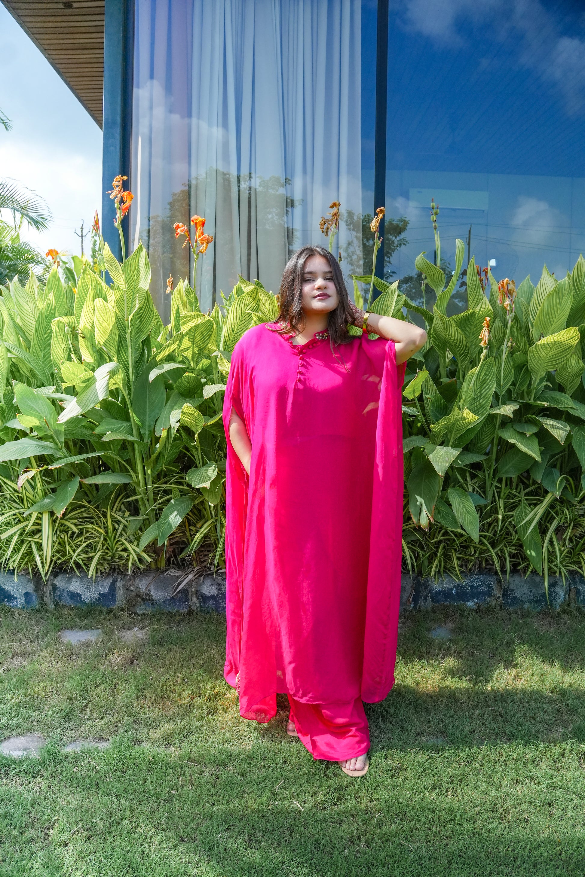 A vibrant solid pink kaftan set designed for effortless elegance and comfort. Featuring a relaxed silhouette with flowing sleeves, a soft fabric drape, and side pockets for added functionality. Perfect for casual outings, resort wear, or relaxed festive gatherings.
